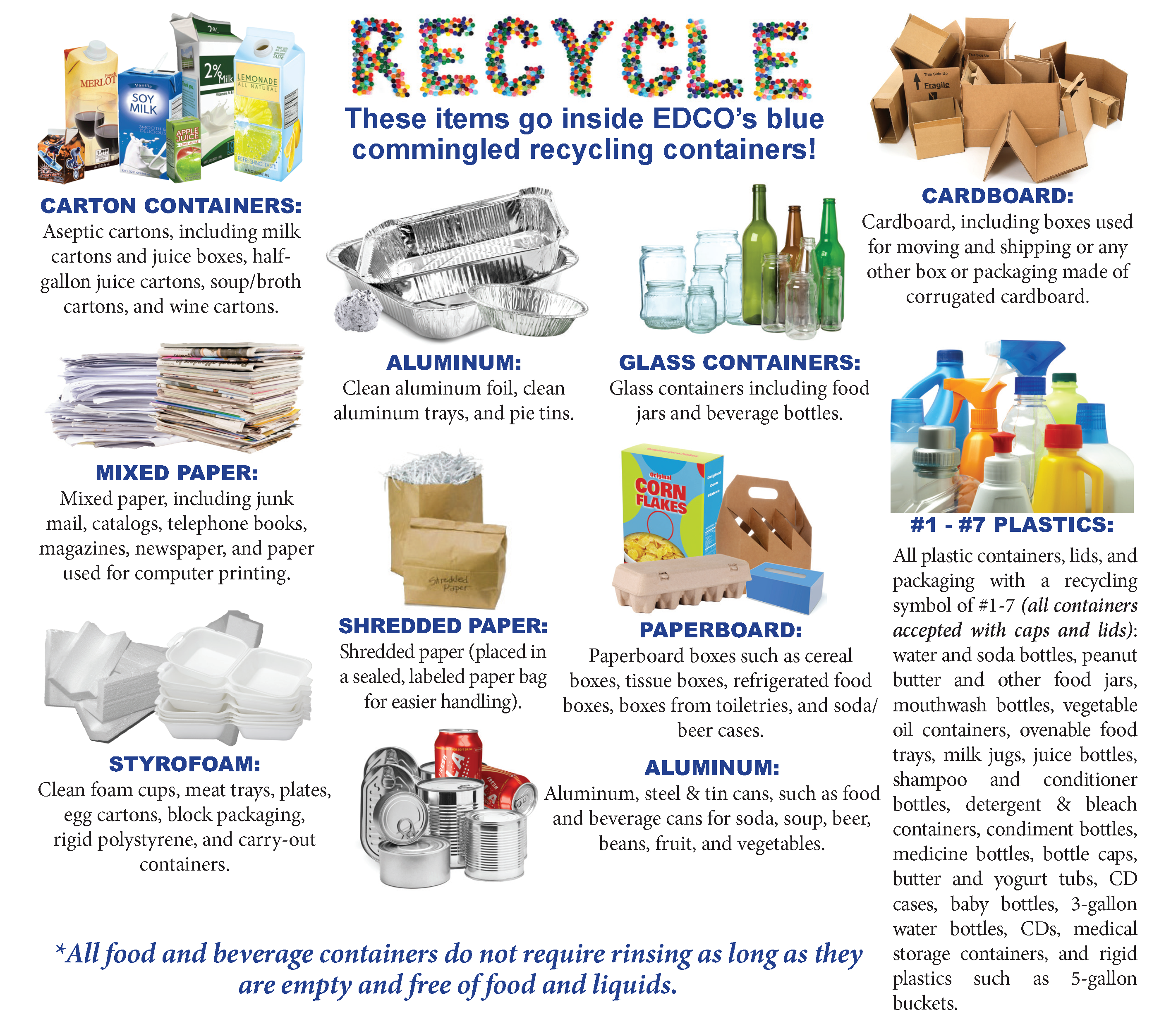 *All food and beverage containers do not require rinsing as long as they are empty and free of food and liquids.